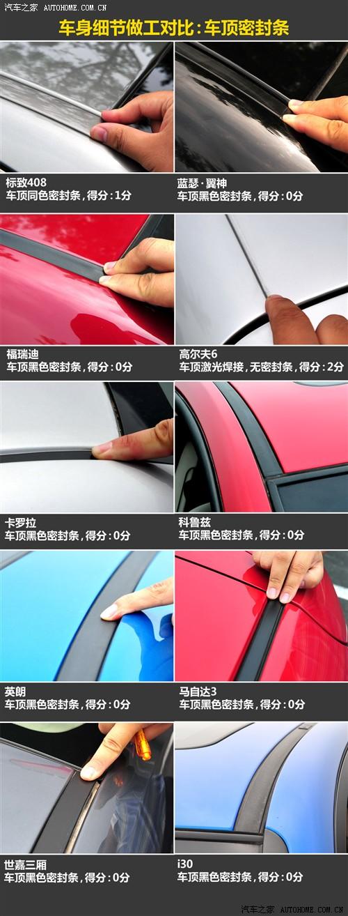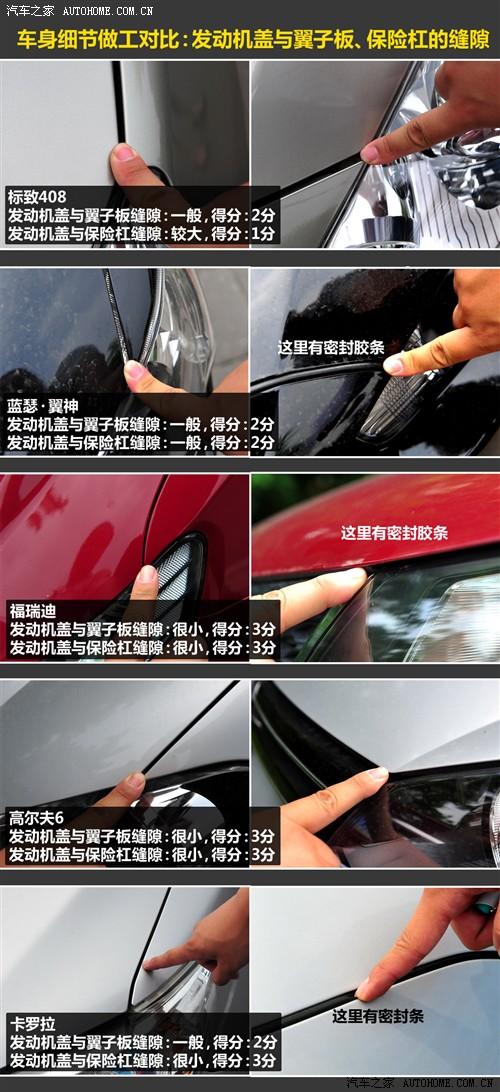 在这一环节的对比中,得分最高的高尔夫占了很大的便宜,其实是因为它采用了激光焊接的车顶,而出乎我们意料的不是高尔夫,而是福瑞迪,他的钣金缝隙控制非常好,发动机盖与翼子板和保险杠的接缝都非常小,在10款车中都是最小级别的。
