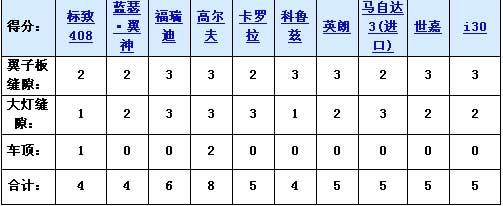 2、发动机盖与大灯的接缝。十款车相比的话,缝隙较小的3分;有些车缝隙中有密封条,视为缝隙较小;缝隙一般大的得2分,缝隙较大的得1分。