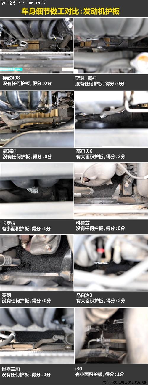 在发动机护板这方面,高尔夫6和进口马自达两厢有大面积的发动机护板,能够起到一定的保护作用,i30和卡罗拉有小面积的护板,而其他6款车型则没有任何护板。