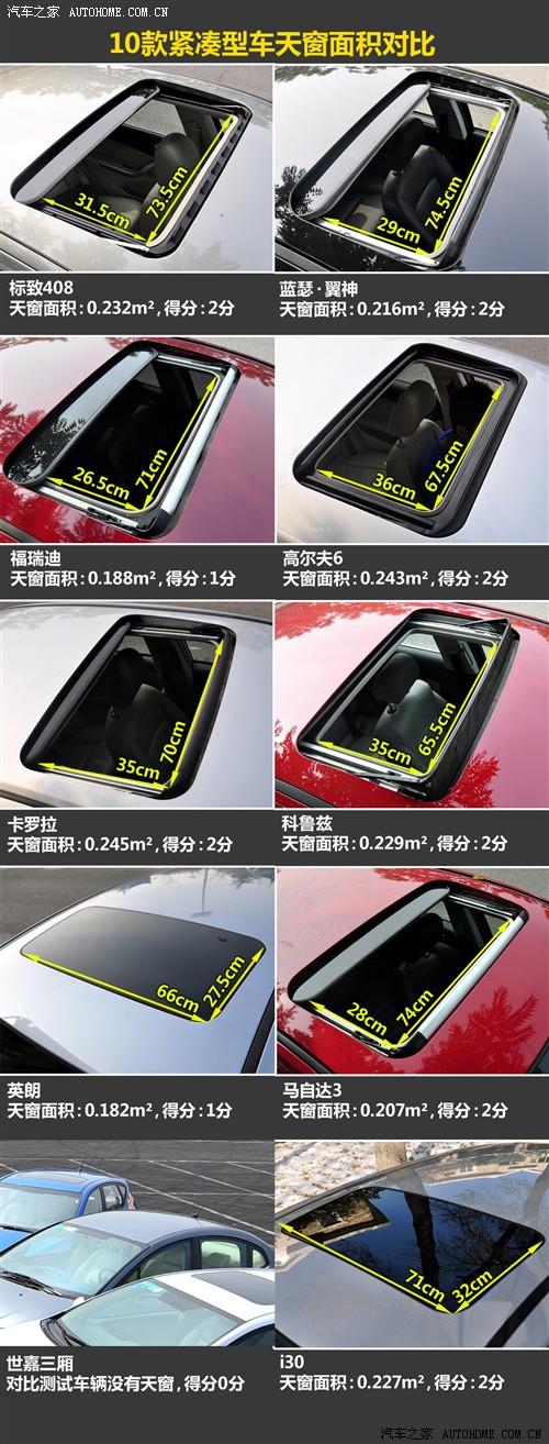 对于很多购买紧凑型车的用户来说,“天窗”对他们有很大的吸引力,不仅因为这是一项很显豪华的配置,天窗对于车内的换气、车内气氛的营造也具有很大的作用,所以我们比一下十款车谁的天窗面积最大,谁的天窗就更有优势。