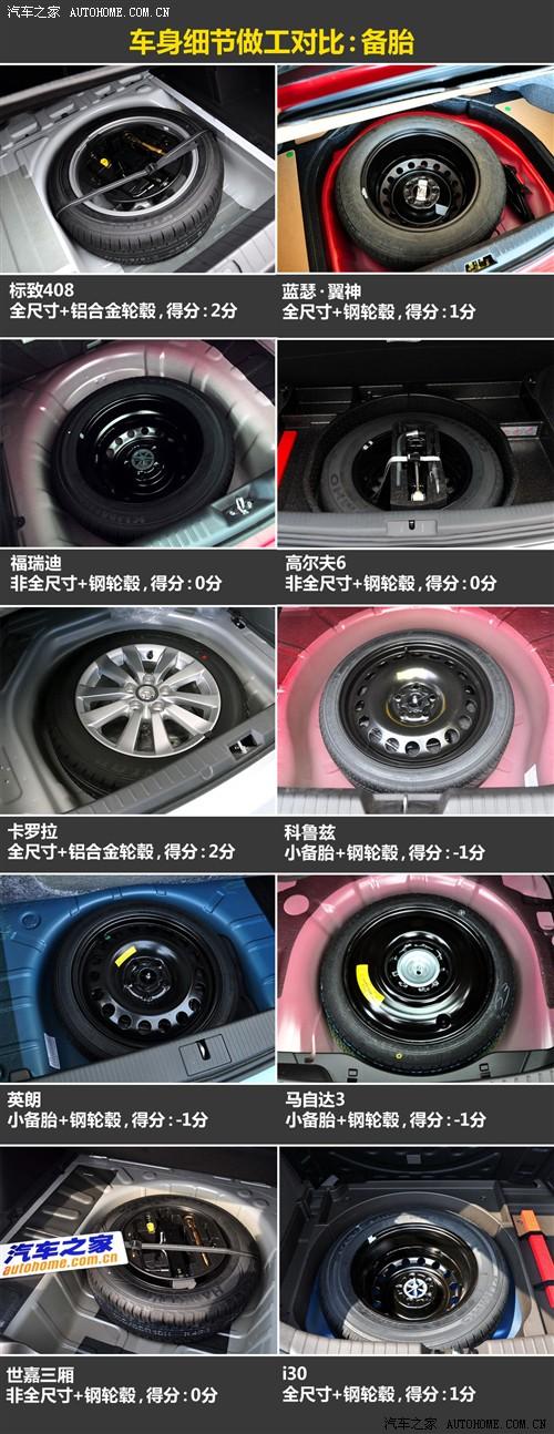 在这一环节的对比中,只有标致408和卡罗拉使用了难得一见的铝合金轮毂,其实408的低配车型使用的也是钢轮毂。其他大部分车型都是钢轮毂和非全尺寸备胎,其中值得商榷的就是福瑞迪,他全系都是195mm或者205mm的轮胎,但备胎却都是185mm,原因当然是为了节约成本。同时,科鲁兹、英朗和马自达3两厢使用的小备胎对于使用有一定的影响,我们必须扣分。