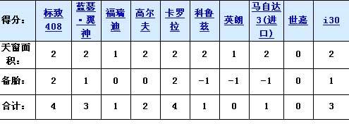 在天窗和备胎的对比中,得分最高的是408和卡罗拉,因为他们都具有很大的天窗和铝合金轮毂的全尺寸备胎,而得分最低的英朗则主要是因为备胎扣分,世嘉则是因为没有天窗,备胎也没有任何特点。