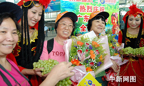 中新网广州7月31日电 (莫非 林月明)在广州白云机场出发厅,身着漂亮维族服饰的姑娘热情地将缤纷美丽的鲜花送给游客,盛情邀约广东游客赴美丽的新疆旅游。这是自“7·5”事件后,广东首批赴新疆旅游的游客上航班前经历的一幕,意味着暂时停滞了近一个月的广东新疆游市场,终于全面恢复正常。