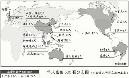 传统上来说,东南亚一带一直是华人经济比较活跃的地区,所以在这一带,企业数量和富豪人数是基本成比例对称的;然而在欧美地区,虽然有数目众多的华人经济,但大都以餐饮业等小规模经营为主;这一地区也有不少华人在近年来迅速成长为IT经济的领袖,但个人财富的积累还没有那么快。