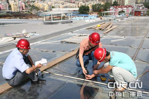 中铁建工集团技术人员正在对北京南站太阳能光伏电池板进行单体测试