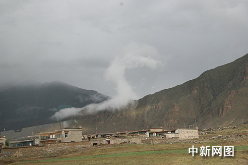 在从拉萨市去当雄县的路上,记者见到了这朵酷似飞龙的云,从一座村庄的上空腾飞。