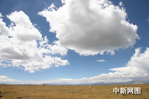 远远望见西藏“圣湖”纳木措,草原山的云洁白而接近,令人感觉伸手即可触及。
