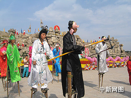康庄文化节上,来自新疆达的瓦孜高空花式走绳演员的高空王子阿不来提•麦军在这里亮相。他在表演各种高空绝技,内地人有机会在家门口欣赏到西域维族兄弟惊心动魄的高空才艺。