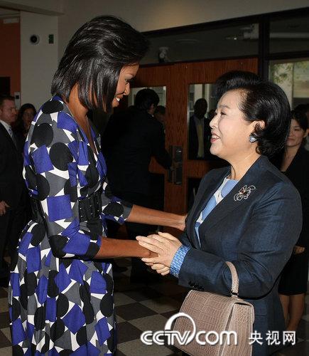 美国第一夫人米歇尔(左)与韩国第一夫人金润玉。