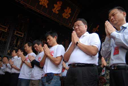 中国国家宗教事务局副局长齐晓飞(右起),凤凰卫视董事局主席、行政总裁刘长乐,以及刘德华、冯小刚、张国立、葛优、郑秀文、容祖儿、林保怡等多位演艺界人士参加法会为灾区祈福。