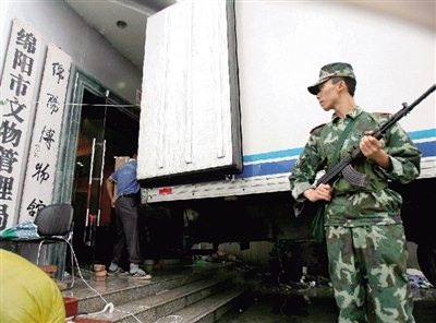 昨天,在荷枪实弹的武警押运下,包括汉代说唱俑、摇钱树等国宝在内的6091件文物从绵阳博物馆紧急转移到广汉三星堆遗址博物馆库房存放。因担心唐家山堰塞湖可能溃坝导致洪水毁坏文物,绵阳博物馆决定紧急转移2.5万件文物,当天转移了第一批。