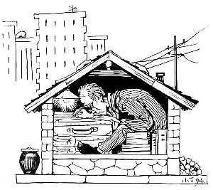 陈四益回忆中,丁老有着老一辈知识分子的风骨,他说:“他的生活一直很艰苦,但是他从来不挑挑拣拣。”当年,丁老师给巴金等作家的书配插画时,正在美术馆做给画贴标签的工作,他就是在那些标签纸上画书的插图的。丁老师的住房条件一直十分艰苦,房子很小,最后屋子里东西堆到放不下,他就只好自己去租了一间老房子搞创作。(如图丁聪漫画《书中没有黄金屋》)