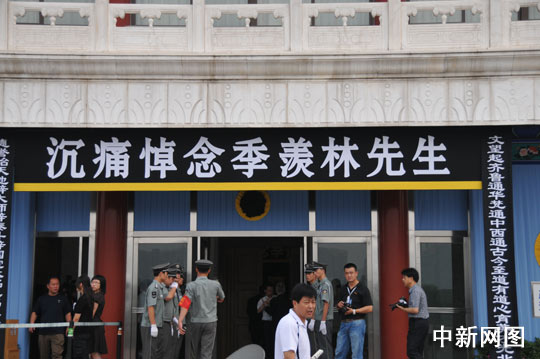 中新网7月19日电 (张中江) 著名国学大师季羡林先生的遗体告别仪式今日上午在北京八宝山革命公墓东礼堂举行,灵堂外一副“沉痛悼念季羡林先生”的黑色挽联格外醒目,上联为“文望起齐鲁通华梵通中西通古今至道有道心育英才光北大”,下联为“德誉贻天地辞大师辞泰斗辞国宝大名无名性存淡泊归未名”。
