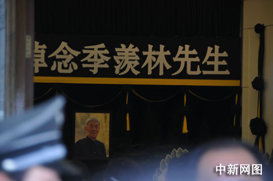 中新网7月19日电(张中江) 著名国学大师季羡林先生的遗体告别仪式19日上午在北京八宝山革命公墓东礼堂举行。灵堂的上方悬挂着黑底白字的横幅“沉痛悼念季羡林同志”,横幅下方是头戴绒帽、身穿蓝色中山装的季老遗像。