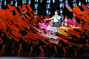 昨日的演出现场首次让媒体先睹为快。从现场看,此次人民大会堂的舞台已改造成上下两层,并以巨大的环形阶梯形式从高处过渡到地面,中间的背景大屏幕则一直在播放与每个段落有关的多媒体影像。大量的光影投射和强大音响效果的配合,营造出了十分震撼的舞台效果。