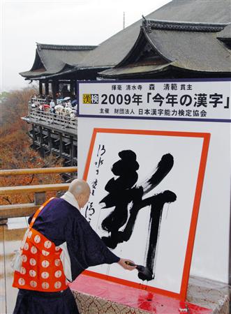 中新社东京十二月十一日电 日本十一日在京都著名古刹清水寺公布惯例的“今年的汉字”评选结果,“新”字当选为描绘二00九年的世象“代言人”。