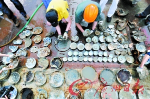 在众多瓷器中,一块直径约60厘米、表面斑驳泛着铜锈的铜板引起记者的注意。“南澳Ⅰ号”考古现场文物组人员告诉记者,这样的铜材还发现很多。孙键也介绍,这些铜板是一摞摞堆积的,而考古现场还出水了为数不少的铜钱。“要不是走私,也是夹带,实际上从宋朝开始铜料已经实行了禁运,明朝万历年间更是如此。”