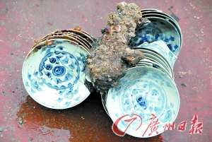 记者了解到,古沉船经清淤后现身的3组木质隔舱板位于沉船中部,其中一块已经现出约4米长的一段。隔舱板之间,已能够清晰看到码放整齐的一摞摞瓷器等文物。成摞瓷器基本上都是侧立横放并交错码放。考古队员在水下见到的文物种类主要是青花瓷大盘,也有少量碗、钵、杯及金属凝结物。而目前已出水文物主要类型也仍然是外销瓷器青花瓷大盘、碗、钵、杯、罐、瓶等,此外还有釉陶罐、铁锅及铜板等。瓷器的主要产地确定为福建平和窑及江西景德镇。