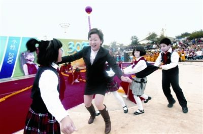 据悉,这是江岸区教育局为纪念改革开放30周年组织的“童心童趣30年”展演。各小学经过精心策划,将饱含时代烙印的经典童年游戏和电视剧人物搬上舞台,引来数千市民围观。