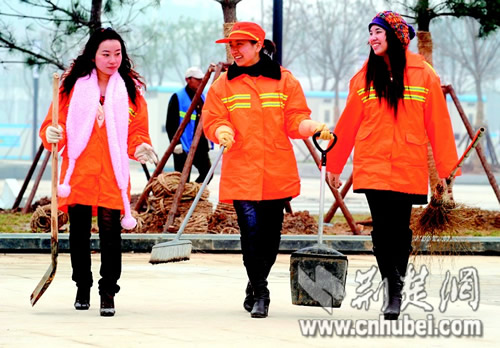 荆楚网消息 (楚天金报) 记者石亮、邹斌报道:很多人不会把年轻、时尚和环卫工想到一块,更少把大学生和环卫工联系到一起。在武汉火车站东广场,三名年轻时尚的女大学生,就高高兴兴地做起了“城市美容师”。同事们赞许三人:“干得挺不错!”