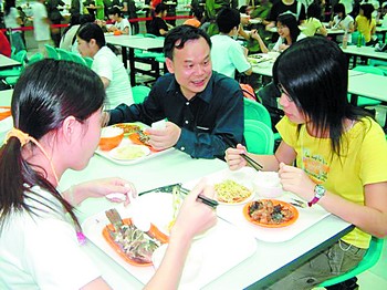 周其凤常与学生一起在学校食堂进餐,了解各方面情况。 资料照片