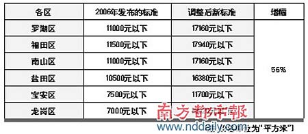 继去年5月深圳市国土房产局公布了全市6区享受优惠政策的普通住房价格标准后,昨天,该局再次公布了调整后的这一标准,并决定自今天起执行。此次公布的新标准在去年基础上大幅调高,特区内的罗湖、福田、南山三个区的标准都超过了17000元。宝安、龙岗两区的标准也超过了10000元。