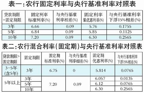 据了解,农行的固定利率房贷业务有两种产品:一是个人住房固定利率贷款,在整个贷款期限内利率保持固定不变;二是个人住房混合利率贷款,在贷款开始的一段时间内(利率固定期)利率保持不变,利率固定期结束后转换为浮动利率。农行此次的利率调整,针对这两个产品分别确定了相应的利率表(详见附表)。
