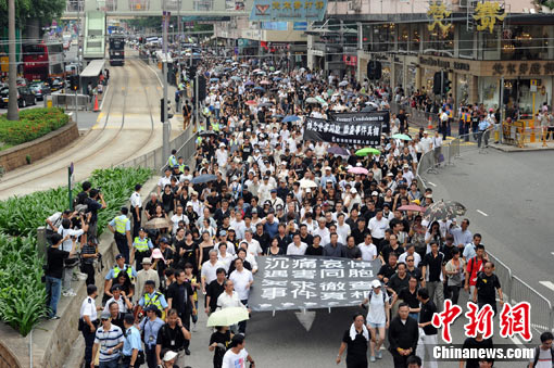 中新社香港8月29日电 (记者 曾嘉)香港29日下午举行“沉痛哀悼遇难同胞、要求彻查事件真相”游行,游行以沉默及平和方式进行。主办方表示,游行者达8万人。特区行政长官曾荫权表示,香港市民的理性游行加强了他处理菲律宾人质劫持事件善后工作的决心。