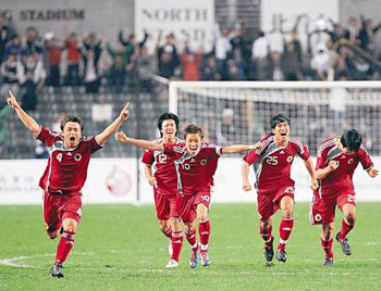中新网12月11日电 据香港《明报》报道,在特首曾荫权及9482名观众见证下,香港足球缔造历史,10日晚苦战120分钟与朝鲜踢成1﹕1,互射12码香港男足胜5﹕3,历来首度在综合运动会晋身决赛,并确保有一面奖牌,12日下午5时将在香港大球场上演决赛,与日本争夺金牌。