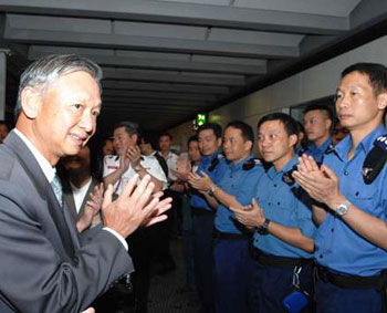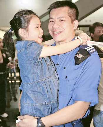 中新网5月23日电 据香港大公报报道,参与四川大地震搜救工作的香港搜救队成员,22日晚自成都返港,获得英雄式的欢迎。香港保安局局长李少光在欢迎式上致词,盛赞各人表现英勇和专业,不畏艰辛的无私奉献,令港人感到骄傲。仪式完成后,队员上前轻吻妻儿,更有人不禁流下男儿泪。