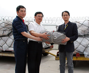 四川省人民政府港澳事务办公室副主任贺平感谢特区政府,为地震灾区民众送上急需的帐篷。