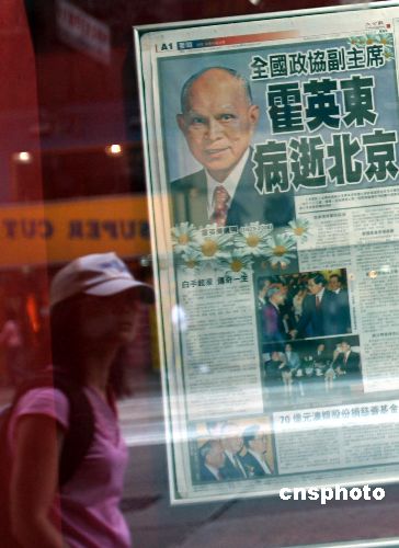 全国政协副主席霍英东28日晚七时许病逝于北京协和医院,终年八十四岁。29日,多份香港报章大幅刊登报导霍英东病逝消息。中新社发 洪少葵 摄
