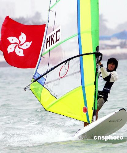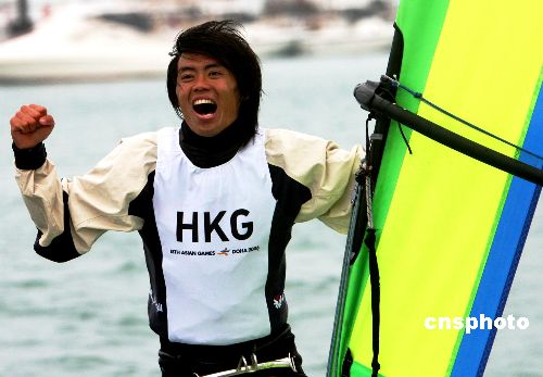 当地时间12月11日,多哈亚运会滑浪风帆进行最后一天两场比赛,香港滑浪风帆好手陈敬然,夺得男子轻量级赛事金牌,队友何智豪、陈慧琪分别为香港增添两面银牌。中新社发 洪少葵 摄