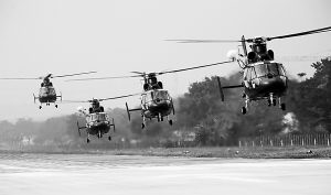 14时20分,直升机编队训练准时开始。随着螺旋桨由缓而急的旋转,巨大的轰鸣由远而近,战鹰按编队队形凌空列队,机身下的草坪上卷起绿色涡旋。随着指挥员一声令下,战鹰猛然加速,向远山轻盈飞去。