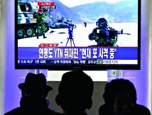 韩国各界对军方举行射击训练的消息十分关注。街头公共电视屏幕前挤满了观众。
