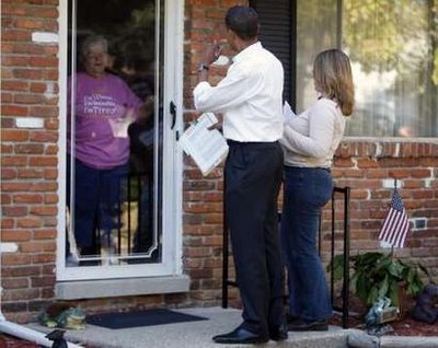 挨家挨户拉票中,几位居民向奥巴马表达了对经济的忧虑;很多经济学家认为美国经济正在走向衰退,由于全球金融危机,上周美国主要股指下降了18个百分点。