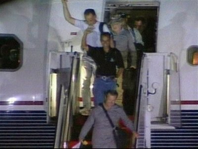 中新网4月16日电 据美联社报道,曾与索马里海盗“亲密接触”的美国“梅尔斯克•阿拉巴马”号(Maersk Alabama)船员于当地时间16日凌晨自肯尼亚乘坐专机返回美国,受到热情的欢迎。