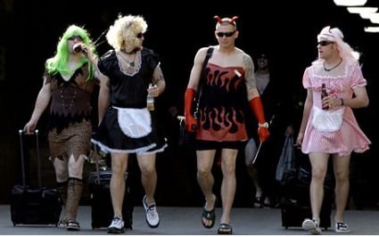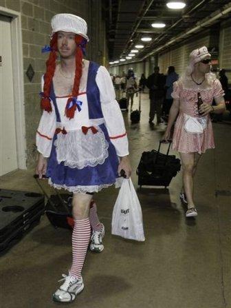 中新网9月25日电 综合报道,美国奥克兰运动家队这个赛季表现很糟糕。24日晚,在阿灵顿的一场棒球比赛中,他们输给了德克萨斯骑警队。根据球队的传统,新秀球员要穿着摇曳的女装回家。
