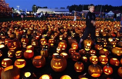 中新网10月6日电 综合报道,美国缅因州坎伯兰10月4日举行盛大的南瓜节。人们纷纷制作各种精致的南瓜灯,试图打破吉尼斯纪录。