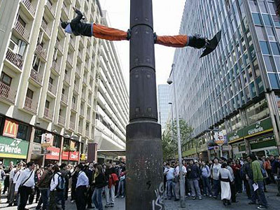 中新网10月16日电 综合报道,智利魔术师Jean Paul Olaverry和Nicolas Luisetti以能使人漂浮在空中的魔术闻名。15日他们在智利首都圣地亚哥街头再次展现拿手好戏,他们轻松的站上电线杆的两侧。
