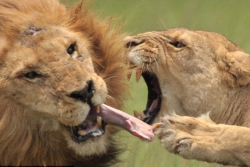 正在博茨瓦纳奥卡万戈三角洲观察狮群的野生动物摄影师李维坦拍下了这组惊人的画面。据他描述,当时邻近一只处在发情期的母狮朝公狮发出暧昧的呼唤,公狮的雌性伴侣立即醋意大发,并试图阻止公狮接近那只发情的母狮。然而,公狮全然不顾伴侣的警告,寻着母狮的叫声蹦去,结果就发生了照片中惊人的一幕。