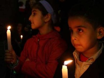 叙利亚儿童点燃蜡烛,参加抗议以色列空袭加沙的示威活动。