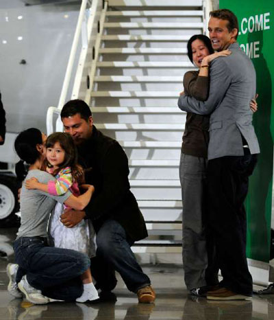 李承恩与丈夫迈克尔-萨尔达杰和四岁女儿汉纳拥抱时,流下喜悦的眼泪。凌志美与丈夫伊恩-克莱顿拥抱,其它家人则挤在他们周围,激动得流泪。