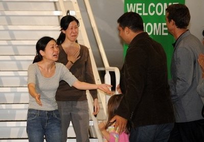 三十二岁的凌志美、三十六岁的李承恩(前译李尤娜)与克林顿所乘坐的飞机在洛杉矶附近的伯班克机场降落,两名女记者下机时,激动得泣不成声。