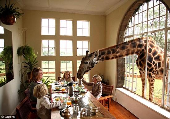 每天快到九点时,这些长颈鹿就把脑袋伸进窗户里,等待主人准备他们的早餐。这种罗斯切尔德长颈鹿是长颈鹿中的第二大濒危种群。妻子坦雅说:“这个庄园以前的主人在长颈鹿的繁育方面做得很成功,我们也将继续下去。”