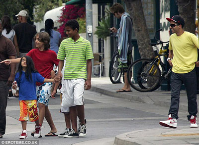 据报道,25岁的哈提穿着黄色的T恤、牛仔裤,同12岁的Prince和留了长发的7岁的Blanket出现在加州圣莫尼卡街头,他们正要一同去书店。和他们在一起的还有一个朋友和一个负责照看他们的人,一行人看上去兴致勃勃,心情不错。