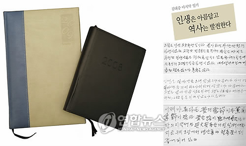 这本小册子长达40页的小册子中,含有金大中在人生晚年对生活的感悟和作为前总统对时局的认识。在日记里,金大中似乎预见到自己已没有多少时日,回顾自己波澜壮阔的人生历程,写下了留给后世的“箴言”。他还提到健康问题和对一生伴侣李姬镐女士的真挚的感情。