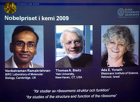 中新网10月7日电 瑞典皇家科学院7日宣布,万卡特拉曼-莱马克里斯南(Venkatraman Ramakrishnan) 、托马斯-施泰茨(Thomas Steitz) 和阿达-尤纳斯(Ada Yonath)因对“核糖体结构和功能的研究”做出突出贡献而获得2009年诺贝尔化学奖。