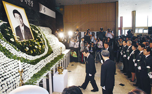 中新网5月26日电 据韩国《朝鲜日报》报道,5月25日,韩国国务总理韩升洙与国务委员们一起来到设有韩国前总统卢武铉灵堂的首尔历史博物馆,进行吊唁。