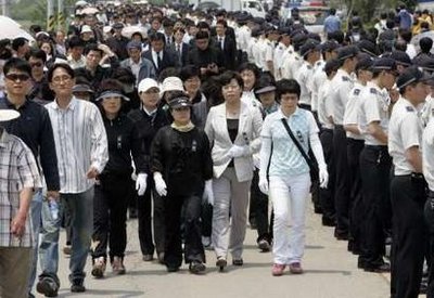 中新网5月26日电 韩国庆尚南道金海市峰下村25日的白天最高气温达到了30度,当天是韩国前总统卢武铉逝世的第三天。从村子入口通往卢武铉灵堂的两公里长双向2车道公路上,没有一点儿背阴处。由于警方在村口阻止车辆进入,市民们只能头顶报纸、手帕、草帽,在往返需要一小时的炎热的柏油路上步行前往焚香所。很多人即使汗如雨下也没有脱掉黑色的西服上衣。